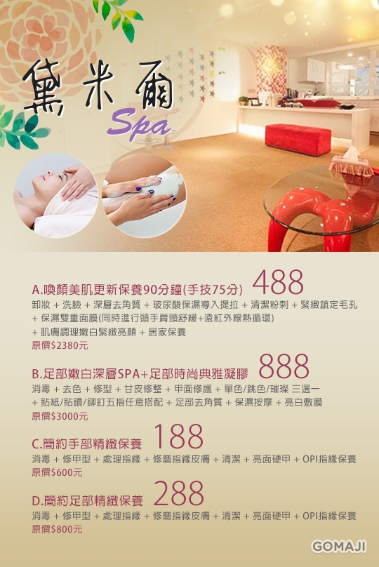 【黛米爾SPA】擁有專業時尚美甲服務超值體驗,腳指指尖散發時尚美麗光采,手/足保養擁有細緻柔嫩肌膚,還有臉部保養專案可選!