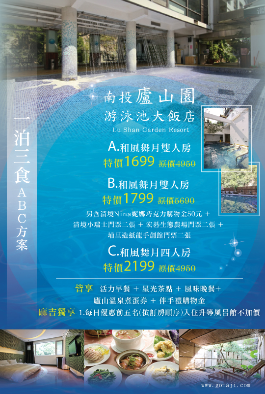只要1699元起,即可享有【南投-廬山園游泳池大飯店】雙人/四人住宿,一泊三食超值方案〈含AB.和風舞月雙人房/C.和風舞月四人房 住宿一晚 + 活力早餐 + 星光茶點 + 風味晚餐 + 廬山溫泉煮蛋券 + 伴手禮購物金,B方案另含清境Nina妮娜巧克力購物金50元+清境小瑞士門票二張+宏碁生態農場門票二張+埔里造紙龍手創館門票二張〉麻吉獨享:每日優惠前五名(依訂房順序)入住升等風呂館不加價